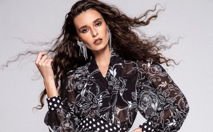 Just as a flower blooms to life in spring, this top with paisley and floral patterns is cut from fabric from an older BASEC design. The long, puffed sleeves and edgy polka-dot belt detail make this top unique.